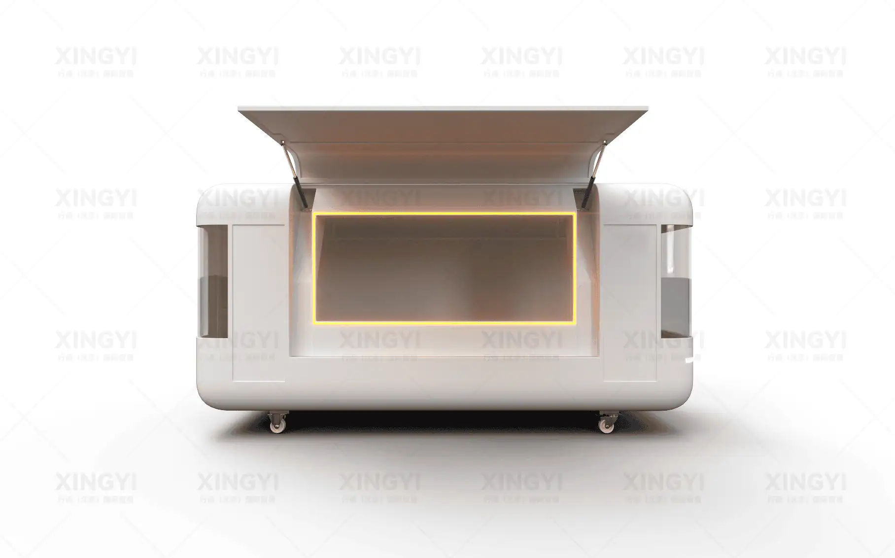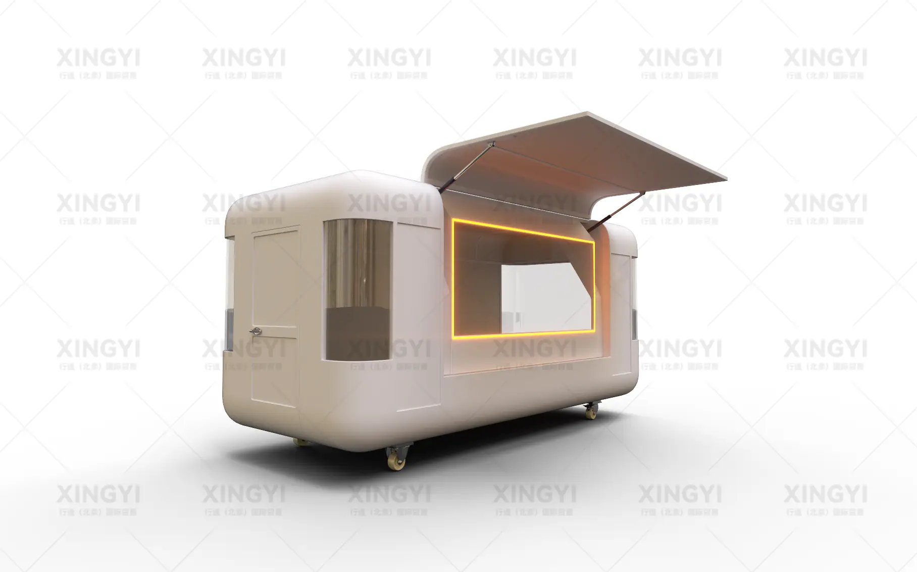镀锌钢管框架、镀锌钢板车身、PVC内墙装饰板、万向轮、鸥翼门、外接电源接口、照明灯管、插座、开关