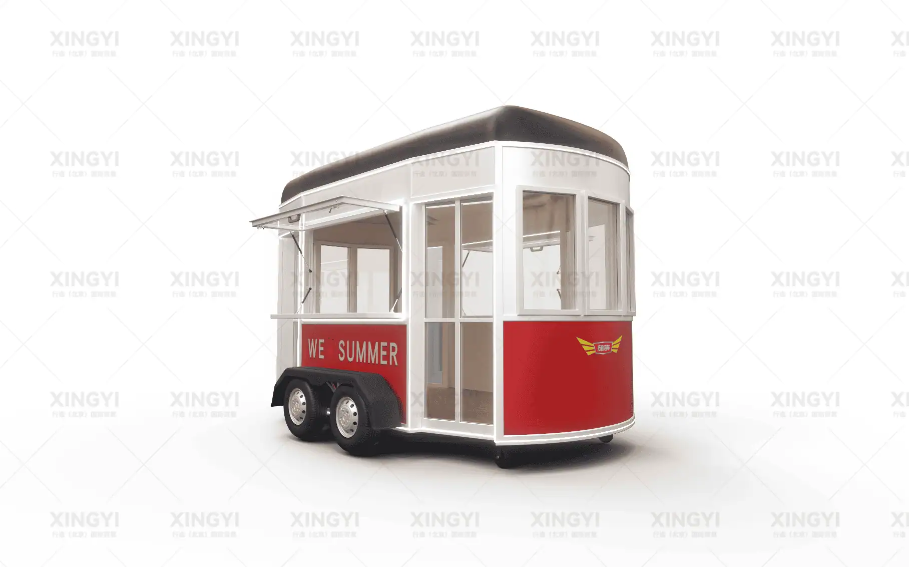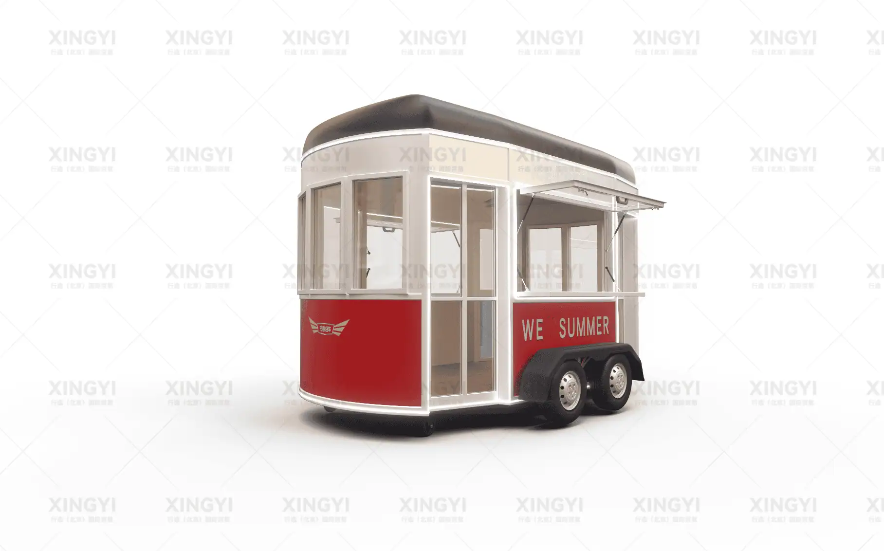 镀锌钢管框架、镀锌钢板车身、PVC内墙装饰板、万向轮、装饰轮胎、外接电源接口、照明灯管、插座、开关