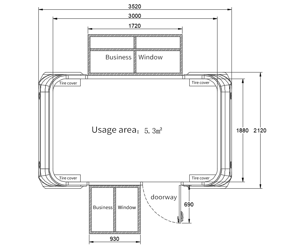 镀锌钢管框架、镀锌钢板车身、PVC内墙装饰板、万向轮、装饰轮胎、外接电源接口、照明灯管、插座、开关
