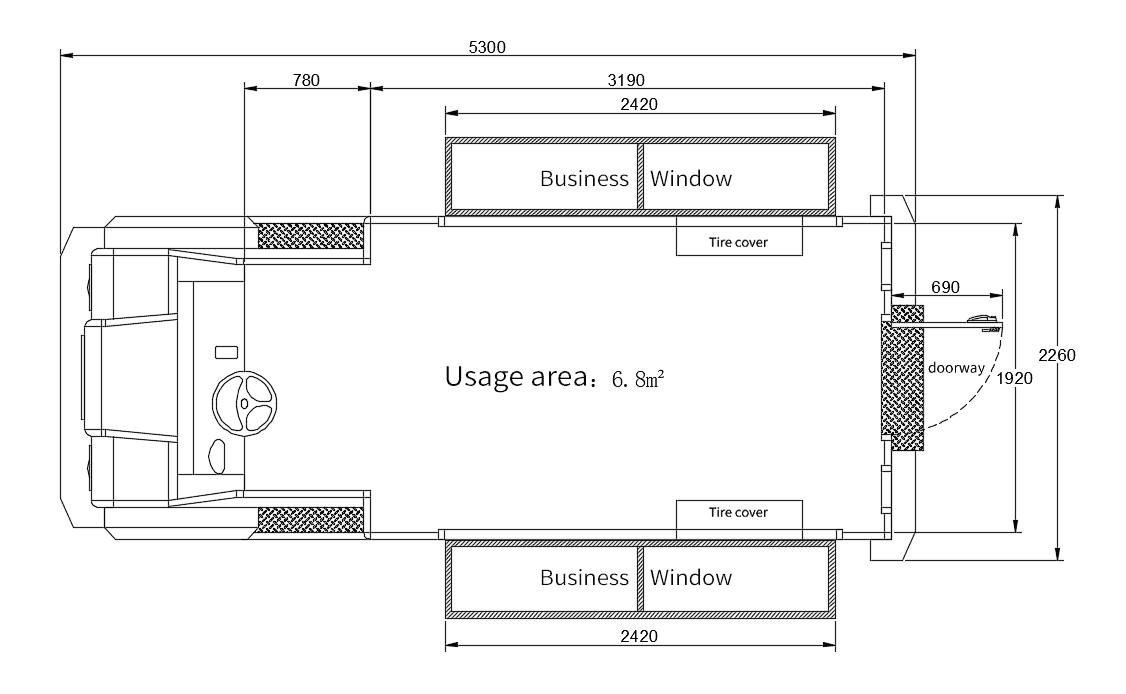 镀锌钢管框架、镀锌钢板车身、PVC内墙装饰板、万向轮、装饰轮胎、外接电源接口、照明灯管、插座、开关